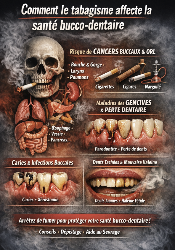 Le tabagisme contribue au déséquilibre de la flore bactérienne buccale et à la diminution du flux salivaire. Ces mécanismes favorisent :